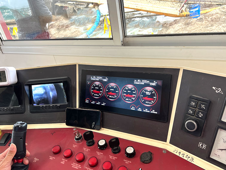 此次定向鉆穿越工程除了穿越距離長、管徑大等困難外,39度的管道折彎對施工機器是巨大的考驗。谷登鉆機通過智能化系統對拉力、扭矩、壓力等運行數據實現全程監控,為施工單位制定和調整施工方案提供及時、準確的數據依據,確保了工作的有序推進。