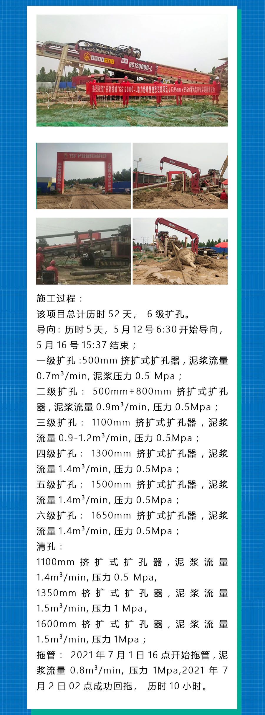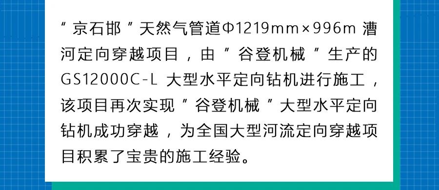 2021年7月2日凌晨02:00,“谷登機械”GS12000C-L大型鉆機施工現場再傳捷報。在“谷登機械”服務工程師保駕護航下GS12000C-L大型鉆機助力泰安岱峰“京石邯”天然氣管道Φ1219×996m漕河定向穿越回拖順利完成!